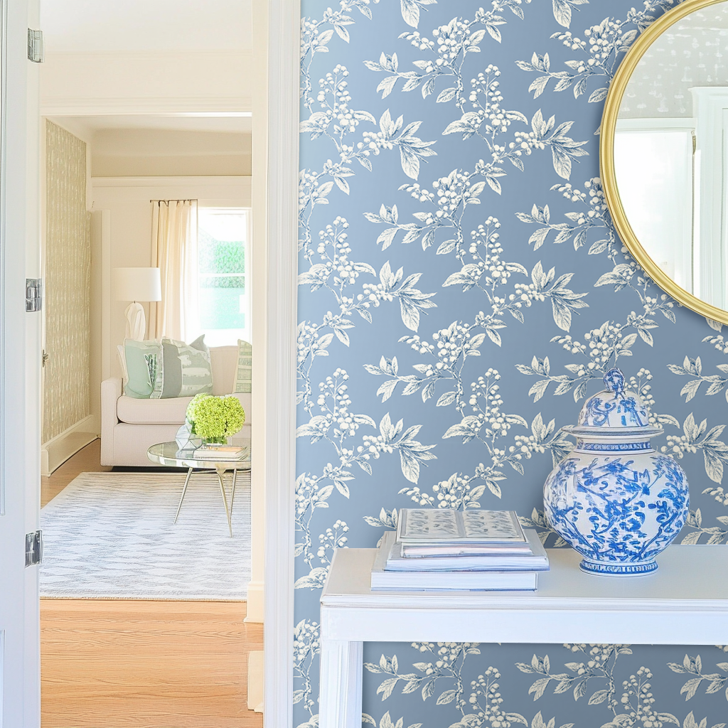 Bring a touch of winter magic to your walls with the Banff Wallpaper. Featuring soft cream winter berries etched delicately against a blue floral backdrop, this playful design brightens any room with its charming beauty. Perfect for adding a cozy yet fresh vibe to your space.