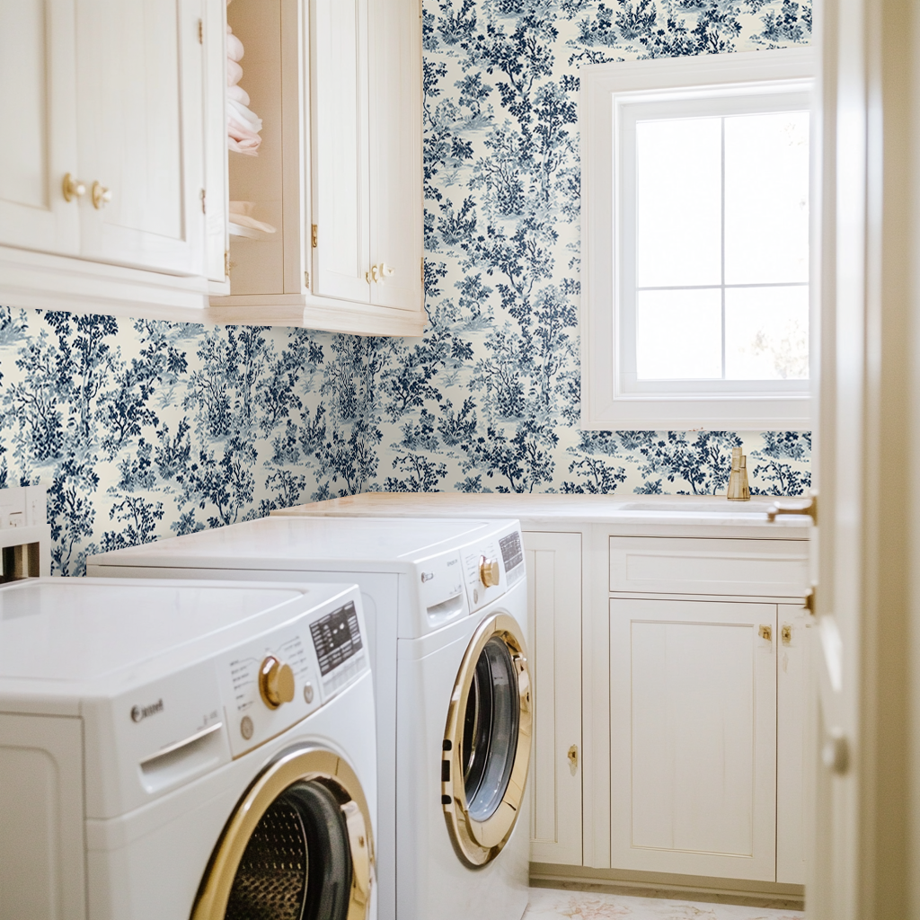 Benjamin is a fresh take on classic toile. Its scenic branches and painterly foliage are rendered in soft blue ink washes on a warm white background, giving any space an elevated yet inviting feel. Perfect for powder rooms, entryways, or any spot that needs a little timeless charm.