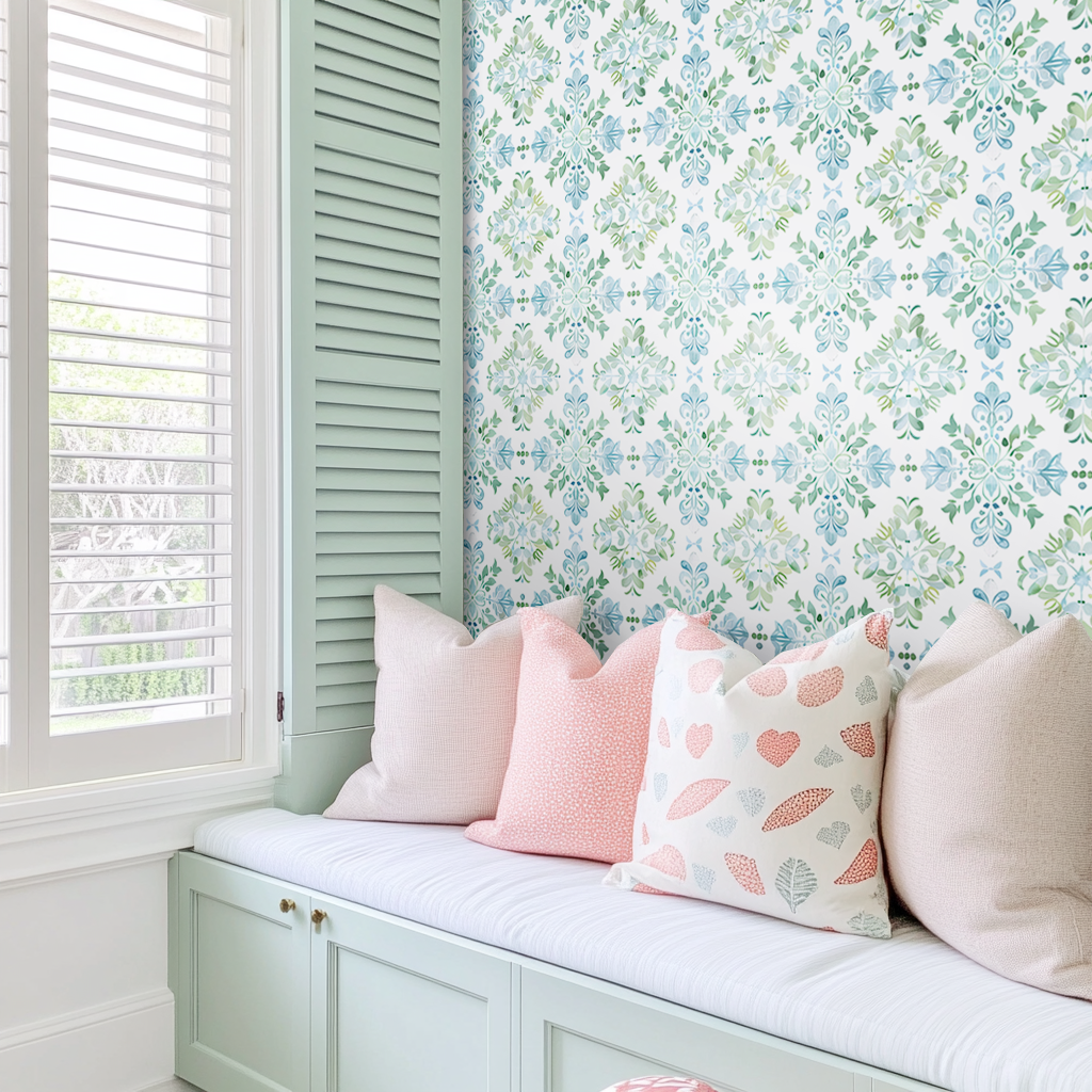 The Claudia wallpaper features a watercolor damask pattern in pastel blue, green, and white with leaves, flowers, and vines on a white background."