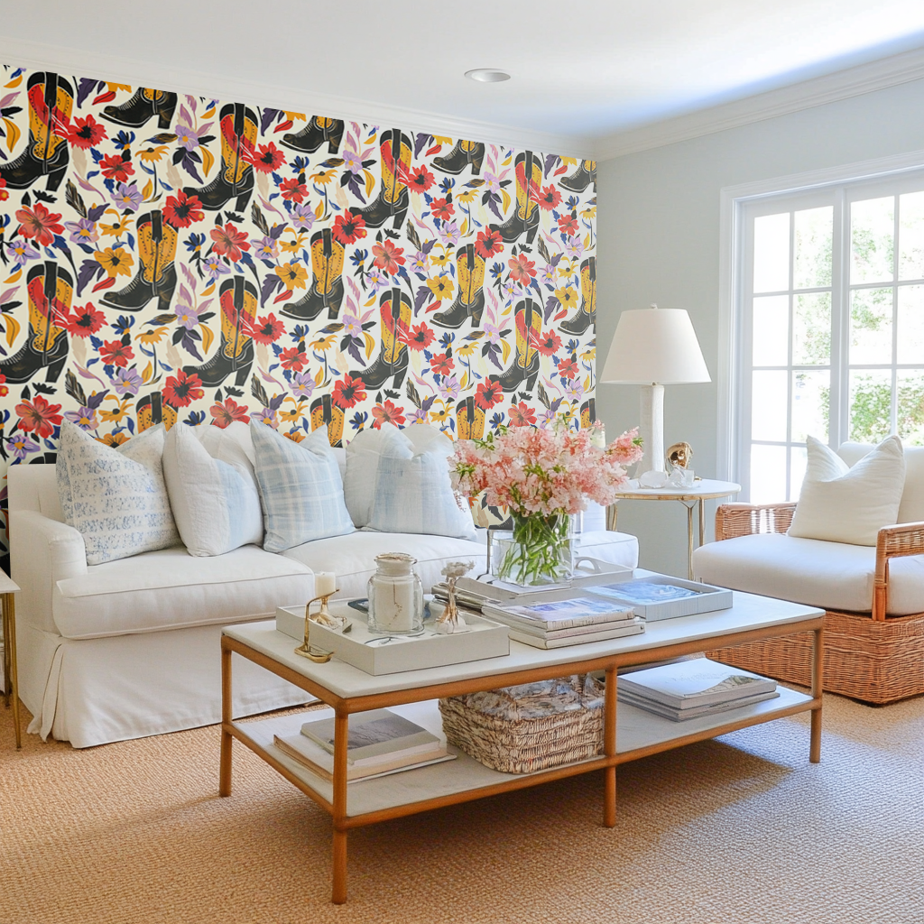 "Harper's Hoedown" -where the wild spirit of the West meets the soft touch of a wildflower meadow. This wallpaper is for the free-spirited girl who's as bold as a cowboy boot and as delicate as the petals that dance around it.