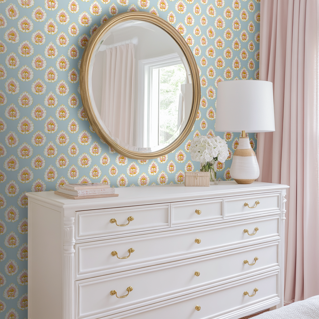 Transform your walls into a cheerful garden with Magnolia Mist Wallpaper. Delicate pink blooms dance across a serene light blue backdrop, creating a space that feels both calming and joyful. Soft touches of yellow add warmth and whimsy to this playful design. Perfect for bedrooms, nurseries, or any room craving a fresh, botanical escape with personality and charm.