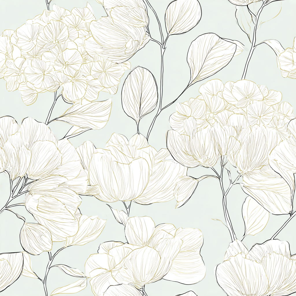 Introducing the Miny Hydrangea Wallpaper, a refined and elegant design featuring a seamless pattern of peonies and magnolias in delicate white line art. Set against a pale blue background, each flower is outlined in soft gold, creating a minimal yet sophisticated design. With its fine lines, subtle lighting, and intricate detailing, this high-resolution vector illustration offers a graceful, professional-quality finish—perfect for adding timeless charm and gentle elegance to any interior space.