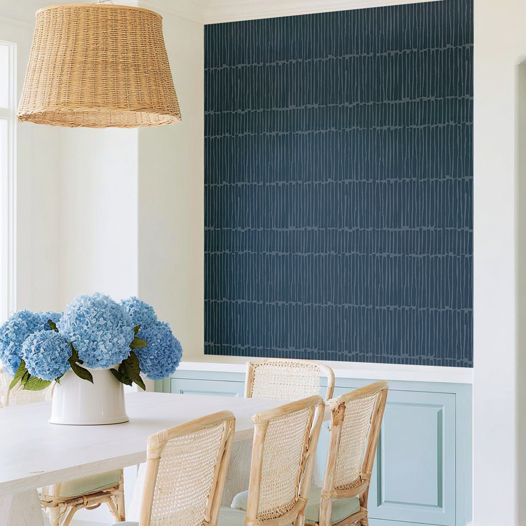 Make a bold splash with Riverline Wallpaper's striking navy geometric stripes. This design delivers serious style impact while keeping things perfectly balanced—it's the Goldilocks of statement walls. The crisp stripe pattern adds visual interest and dimension without overwhelming your space, making it ideal for creating a focal point that feels intentional rather than chaotic. Perfect for anyone ready to elevate their room with personality and polish.