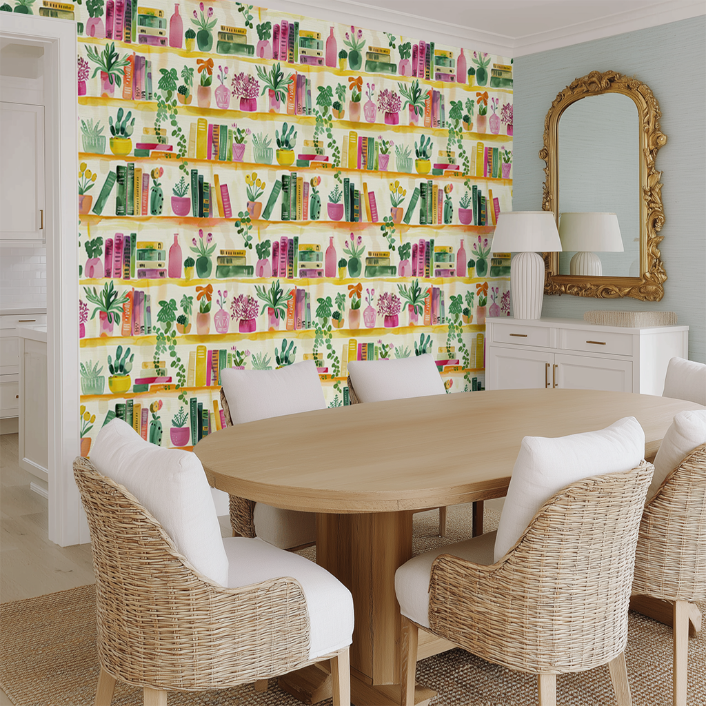 Channel the spirit of a sun-kissed study session with Shelfie Wallpaper, where watercolor books and potted greens turn any nook into a charming retreat. It's not just wallpaper; it's a backdrop for your next great adventure in literature and life!