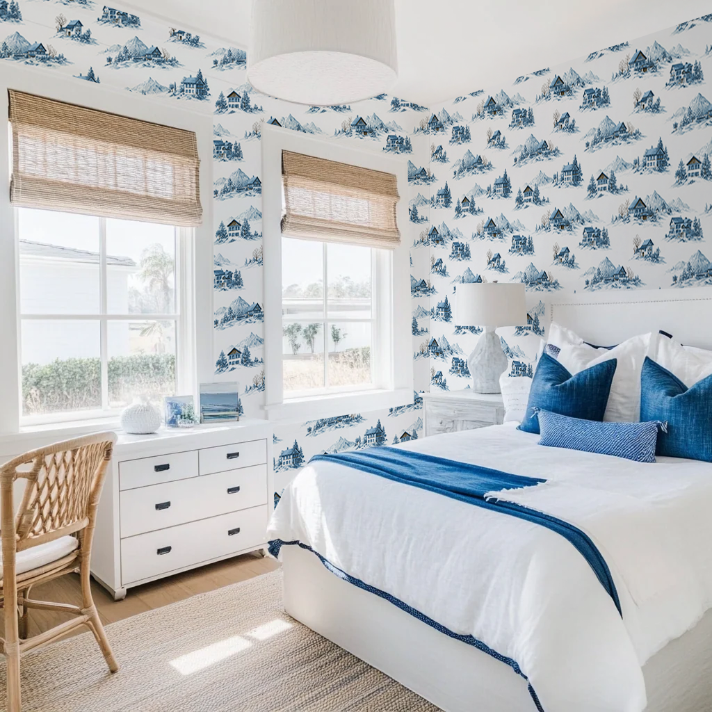 Transform your space with Snowmass Wallpaper, featuring charming blue houses nestled on snowy mountain peaks. This playful design brings a light, airy winter wonderland right to your walls, creating a cozy and inviting atmosphere. Perfect for adding a touch of frosty fun and serene beauty to any room.