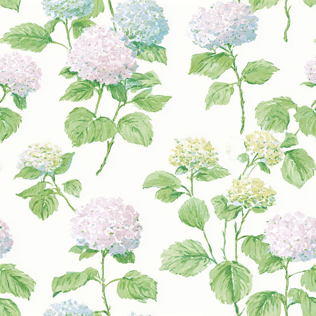 Bring the charm of an English countryside into your home with the Southern Garden Wallpaper. Inspired by the delicate watercolor style of Beatrix Potter, this seamless pattern features soft pastel hydrangeas in dusty pink, baby blue, lavender, and minty green, gently blooming across a fresh white background. Fine brushstrokes highlight each petal and leaf with elegant detail, creating a design that feels like a stroll through a summer garden. Perfect for bedrooms, nurseries, or reading nooks, this wallpaper adds a whimsical, storybook touch to any space.