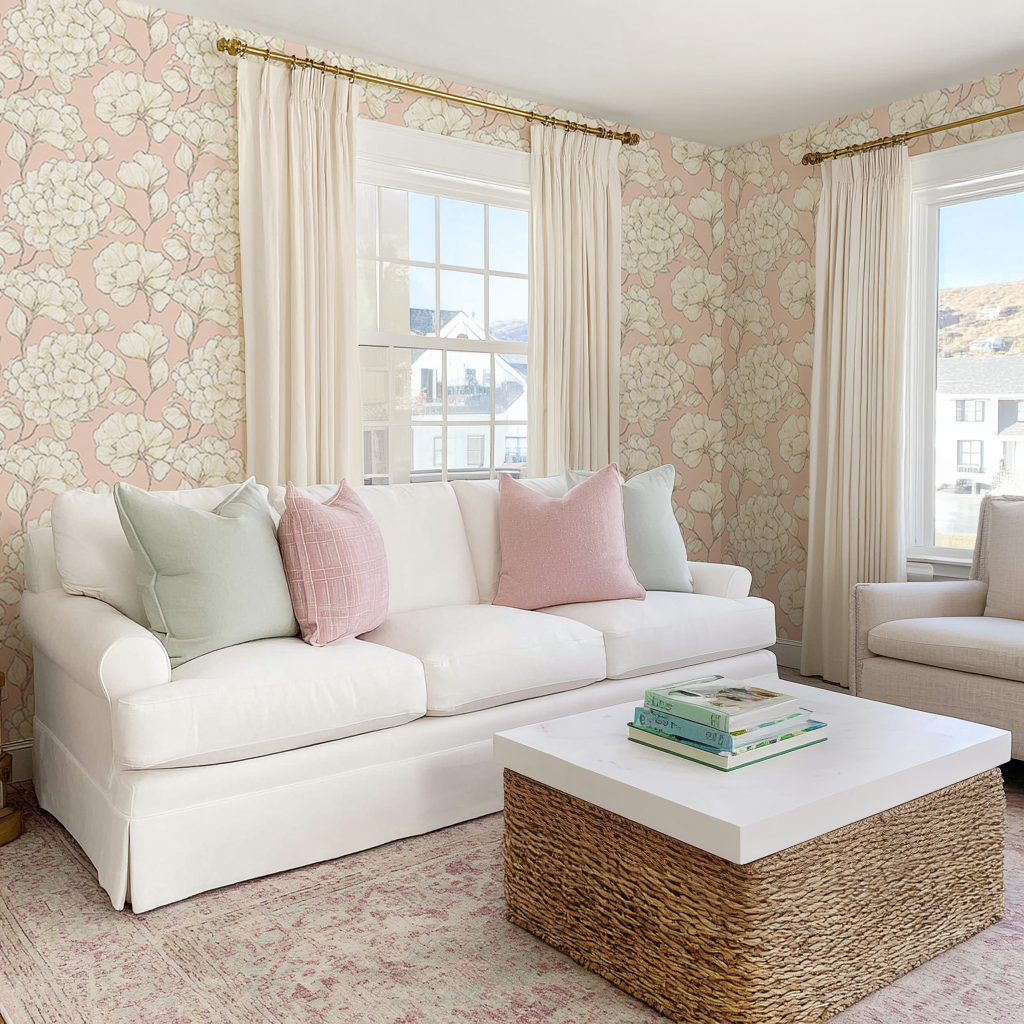 Introducing Think Pink wallpaper featuring delicate white hydrangeas in elegant line art, set against a soft blush background. Light ivory and pale pink tones blend to create an effortlessly chic design that feels simultaneously modern and timeless. This wallpaper is ideal for living rooms, statement powder rooms, or glamorous home offices—any space where you want to impress with quiet sophistication.