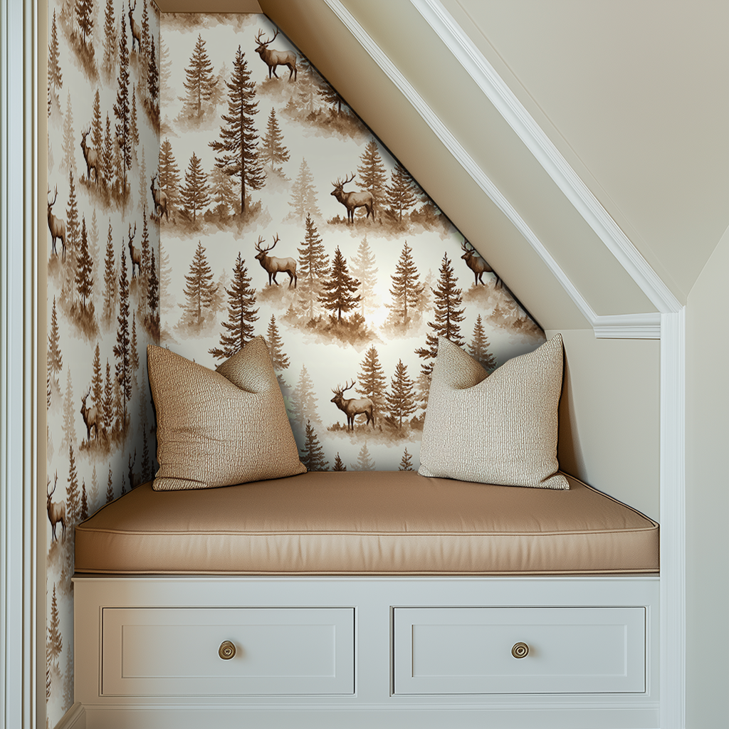 Transform your space with the Whistler Wallpaper, featuring a playful rustic woods scene in warm brown tones. Delight in charming elk wandering through a winter wonderland of bare trees, bringing cozy outdoor vibes indoors. Perfect for adding a touch of nature’s whimsy to any room.